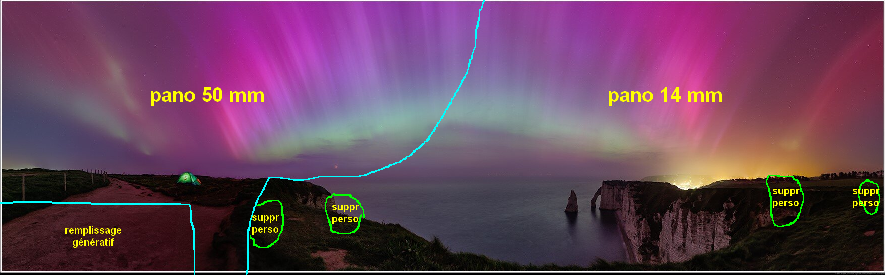 Bonjour Octeville-sur-Mer (76) le 10/10/2024 un peu avant 23h (21h TU). Voici le SAR (Arc rouge stable), qui se cache derrière les nuages au dessus des épaves des barges La Tortue, La Bécasse et La Grenouille. Un SAR n'est pas une aurore même s'il y est associé. C'est une structure optique visible dans la haute atmosphère subaurorale. Alors que les aurores sont créées par des particules énergétiques tombant du ciel et interagissant avec l'atmosphère terrestre, les arcs SAR sont générés par une énergie thermique et cinétique extrême dans l'atmosphère terrestre. Panorama réalisé à partir de 15 photos prises avec un Canon R6 mk II, un Sigma 14 mm f/1.8 Art, poses de 15 s, 800 ISO, f/2. Alignement manuel des images avec Autopano, puis un peu de Photoshop pour enlever les silhouettes floues des amis photographes du club Reflex d'Octeville et des artéfacts d'Autopano. A+ fred