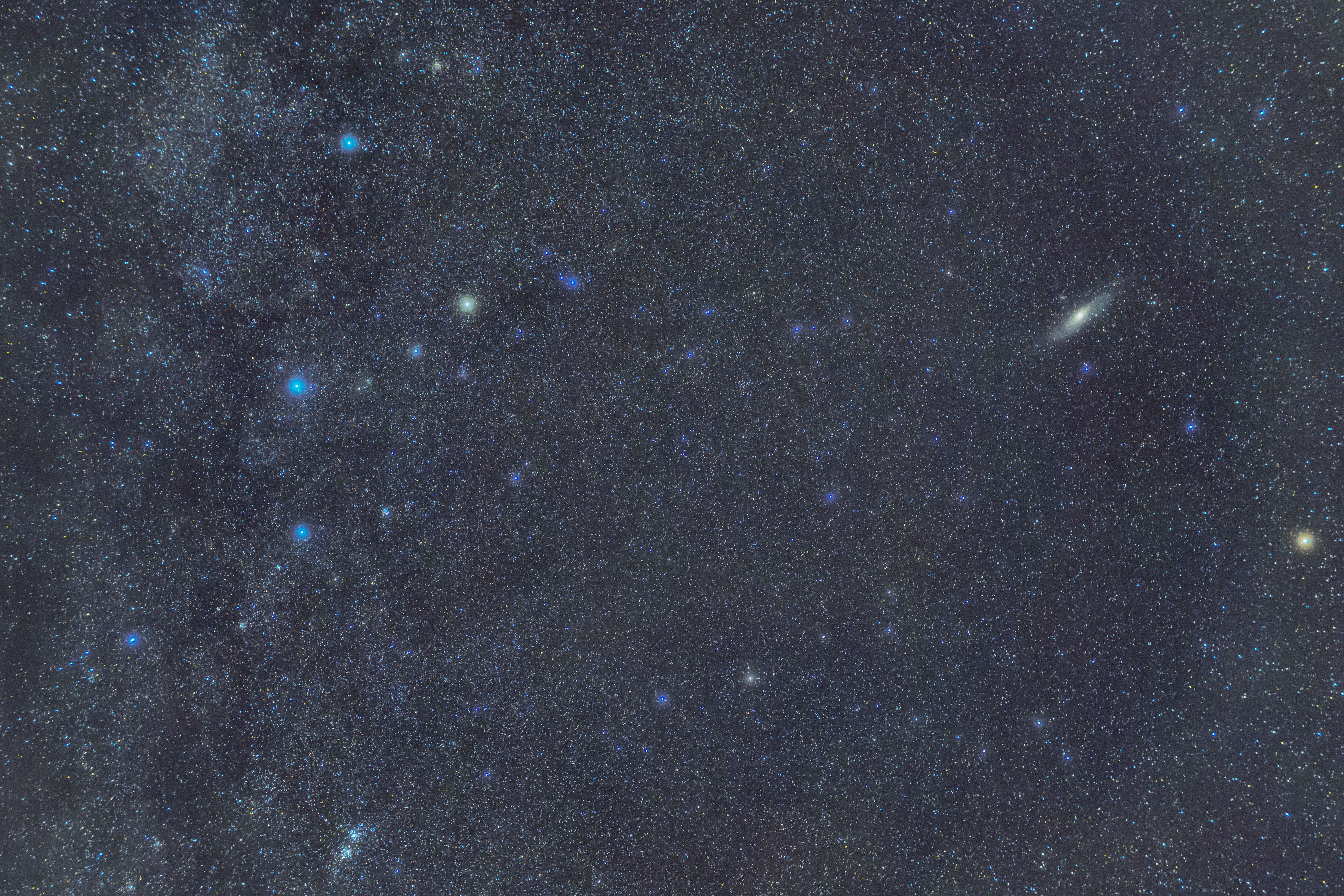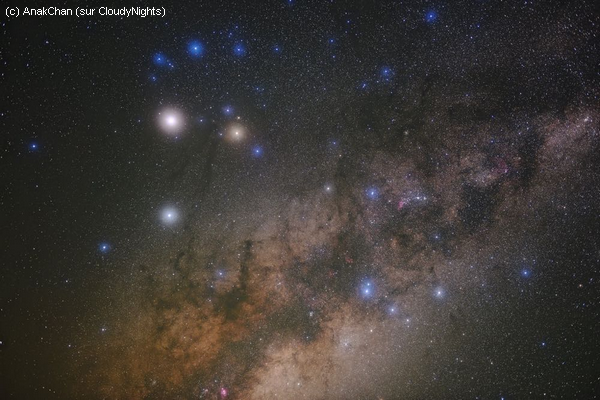 L’effet Akira Fujii L’effet ‘Akira Fujii’ en astrophotographie, est nommé d’après l’astrophotographe japonais Akira Fujii (1941-2022). Il consiste à rendre les étoiles principales plus brillantes et visibles, tout en laissant les étoiles plus faibles moins prononcées. Cela permet de mieux reconnaître les constellations, car les étoiles principales apparaissent comme de gros points lumineux, et leurs couleurs sont également mises en valeur. Akira Fujii a toujours préservé le mystère autour de sa méthode. À l’époque, la photographie étant exclusivement argentique, excluait tout traitement numérique. On pense qu’il utilisait un filtre de diffusion placé devant l’objectif pendant toute ou partie de la durée de l’exposition ou peut-être au moment du tirage des photos. Vous pouvez voir ses photos diffusées par David Malin. Aujourd’hui, on a deux façons de reconstituer cet effet, soit en le simulant numériquement, soit avec un filtre de diffusion dès la prise de vue. Simulation numérique Il existe de nombreux tutoriels pour simuler cet effet avec des logiciels comme Photoshop, Gimp, Iris… Je ne vais pas entrer dans le détail, mais le principe est de sélectionner les étoiles les plus lumineuses puis de leur appliquer un flou gaussien. Ce procédé n’est pas aussi simple à utiliser qu’il n’y parait et le rendu reste très artificiel. Utiliser un filtre physique Filtre du commerce L’utilisation d’un filtre physique de diffusion (type Mist) dès la prise de vue sera la meilleure façon d’obtenir un rendu naturel. Ces filtres créent une lueur autour des zones lumineuses, rendant les hautes lumières moins dures. Cet effet est particulièrement utilisé en photographie de portrait et au cinéma pour lisser les tons de peau et réduire l’apparence des imperfections. On les trouve dans les marques habituelles (Hoya, Kenko, Tiffen, Nisi, Cokin…). Les fabricants proposent généralement deux versions de filtres diffuseurs, les diffuseurs de type clairs (white) et sombres (black). Ils contiennent tous deux de minuscules particules intégrées dans le verre. Ces particules dispersent la lumière, réduisant le contraste et adoucissant l’image. La quantité de diffusion dépend de la densité et de la taille de ces particules. Filtres White Mist : Le verre contient des particules translucides, lui conférant un aspect légèrement dépoli. Ces filtres dispersent la lumière de manière uniforme sur l’image, créant une lueur douce et brumeuse. Ils sont souvent utilisés pour obtenir un effet onirique et lumineux, comme l’effet Akira Fujii recherché. On trouve ces filtres sous les noms White (Pro) Mist, Star Soft, Mist Diffuser White… Filtres Black Mist : Ces filtres contiennent des particules noires qui absorbent une partie de la lumière, réduisant ainsi la luminosité globale tout en la diffusant. Cela produit un effet plus subtil et sombre, avec des hautes lumières moins prononcées. Mais l'image est globalement assombrie ce qui est contreproductif en astrophotographie. Par conséquent, les filtres Black Mist sont moins adaptés que les White Mist. Ces filtres sont disponibles sous les noms Black (Pro) Mist, Mist Diffuser Black, etc. Il existe plusieurs niveaux de diffusion, à savoir 1 (le plus intense), 1/2, 1/4 et 1/8. Une diffusion plus élevée diminue la netteté apparente de l’image. Ces filtres sont toutefois coûteux, entre 30 € et plus de 200 € selon la marque et la taille. Ci-dessous, photo avec un filtre Kenko Foggy B (qui n'existe plus, remplacé par le Prosofton Clear dont l'effet est moins prononcé). Verre anti-newton : Il est également possible d’utiliser un verre traité « anti-newton ». Autrefois, ces verres légèrement dépolis étaient couramment employés dans les caches de diapositives, les porte-films des agrandisseurs, et les verres des rétroprojecteurs pour éviter les anneaux de newton (un phénomène de réfraction lumineuse entre deux surfaces en contact). Cependant, ils sont maintenant assez rares et coûteux dans des dimensions compatibles avec les porte-filtres. De plus, leur effet de diffusion est particulièrement puissant, on doit donc placer le filtre devant l'objectif pendant un court instant pendant la prise de vue ou combiner des poses avec/sans filtre. Bref, c'est pas pratique ! Filtre fait maison On peut créer son filtre de diffusion facilement. Plein de tutoriels expliquent comment faire, avec de la laque à cheveux, de la peinture en spray, en rayant un filtre au papier de verre, ou encore en tendant un film alimentaire étirable. Mais peu ont été éprouvées pour la photographie de nuit. Je retiens l’astuce d'appliquer une fine couche de particules diffusantes sur un verre. Pour le verre, j'ai utilisé une plaque de verre carrée ou rectangulaire glissée dans un porte filtre. Vous pouvez aussi utiliser un simple filtre UV vissé sur l‘objectif. Pour les particules, j'ai essayé de la laque pour cheveux et un spray de vernis acrylique. Pour avoir testé la laque et le spray de vernis acrylique, je trouve l’effet plus agréable avec la laque, mais le filtre est bien plus fragile car les gouttelettes de laque résistent bien moins aux frottements que celles du verni acrylique. Les filtres UV sont disponible à moins de 10€. Il faut qu'ils soient adaptés au diamètre de l’objectif. C’est la solution la plus simple mais aussi la moins versatile car il faudra autant de filtres qu'on a de diamètres différents. C'est pourquoi j'ai opté pour une plaque de verre minéral, de 10 cm de large et 2 mm d'épaisseur, que j'ai glissée dans un porte-filtre de 10 cm que j'avais déjà. Ces verres se trouvent facilement dans les cadres photo 10x15 cm pour moins de 2 €. On trouve des porte filtres de 10 cm de large, pour moins de 30€, avec des bagues adaptatrices pour les différents diamètres de ses objectifs. L'avantage c'est qu'on peut y placer d'autres filtres