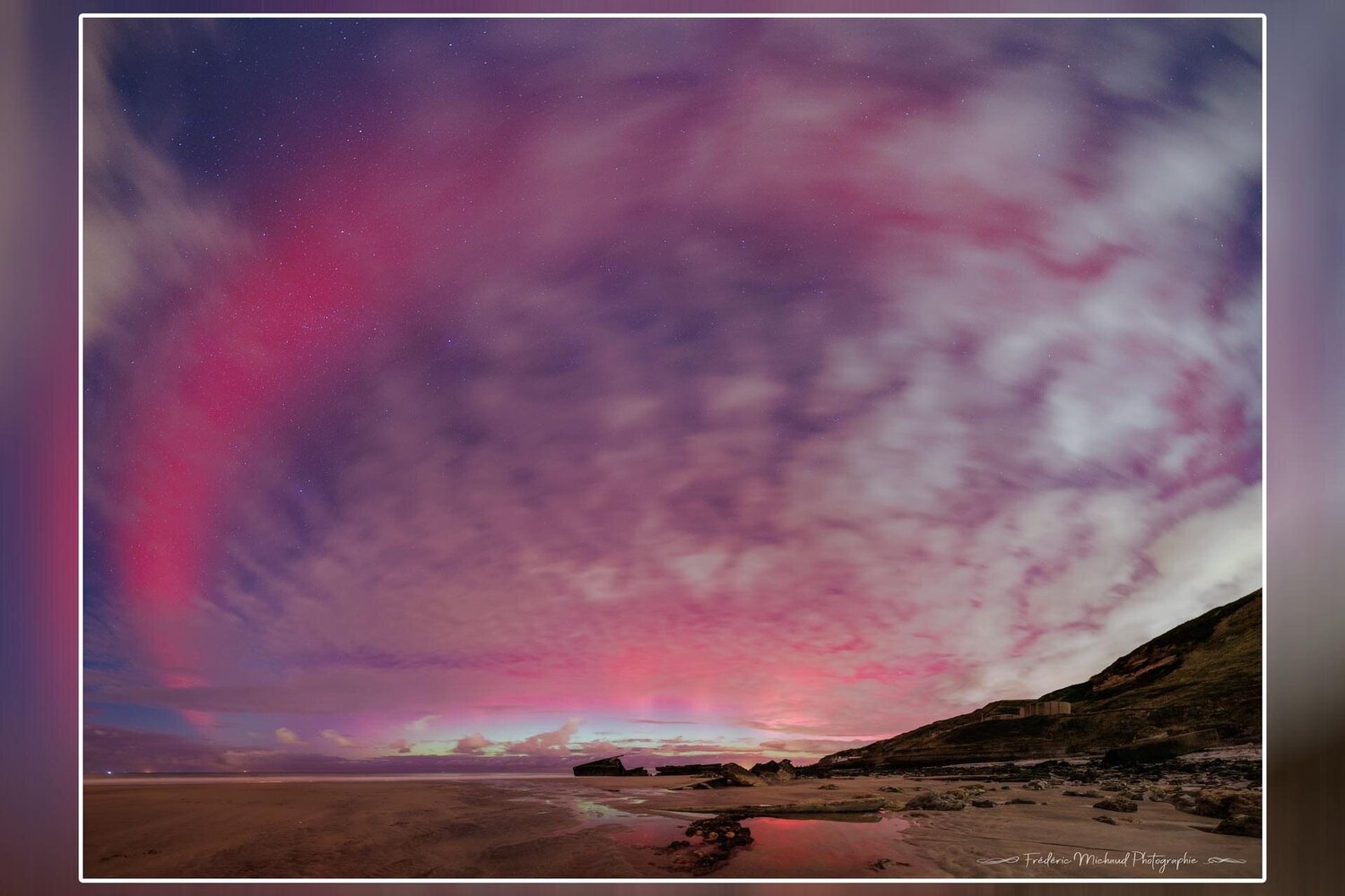 Bonjour Octeville-sur-Mer (76) le 10/10/2024 un peu avant 23h (21h TU). Voici le SAR (Arc rouge stable), qui se cache derrière les nuages au dessus des épaves des barges La Tortue, La Bécasse et La Grenouille. Un SAR n'est pas une aurore même s'il y est associé. C'est une structure optique visible dans la haute atmosphère subaurorale. Alors que les aurores sont créées par des particules énergétiques tombant du ciel et interagissant avec l'atmosphère terrestre, les arcs SAR sont générés par une énergie thermique et cinétique extrême dans l'atmosphère terrestre. Panorama réalisé à partir de 15 photos prises avec un Canon R6 mk II, un Sigma 14 mm f/1.8 Art, poses de 15 s, 800 ISO, f/2. Alignement manuel des images avec Autopano, puis un peu de Photoshop pour enlever les silhouettes floues des amis photographes du club Reflex d'Octeville et des artéfacts d'Autopano. A+ fred