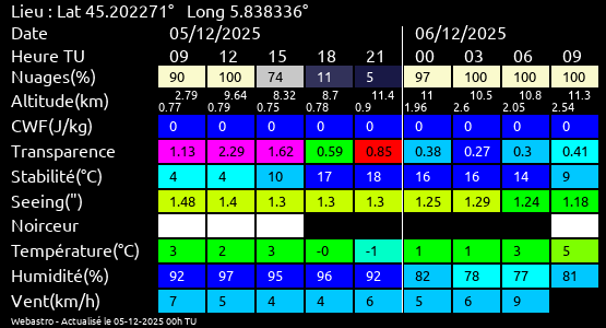 Ces paramètres sont fournis pour la nuit suivante de 12 h TU du jour en cours à 12h TU du jour suivant par pas de 3h.