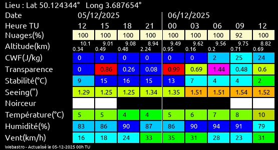 Ces paramètres sont fournis pour la nuit suivante de 12 h TU du jour en cours à 12h TU du jour suivant par pas de 3h.