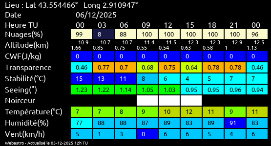 Ces paramètres sont fournis pour la nuit suivante de 12 h TU du jour en cours à 12h TU du jour suivant par pas de 3h.
