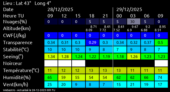 Ces paramètres sont fournis pour la nuit suivante de 12 h TU du jour en cours à 12h TU du jour suivant par pas de 3h.