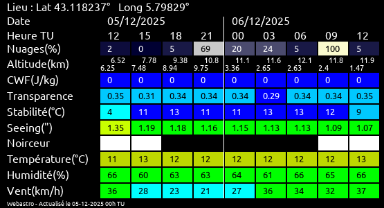 Note: Le "Met'astrogramme" est un tableau recapitulant les prévisions de différents paramètres pour estimer les conditions lors d'observation du ciel.