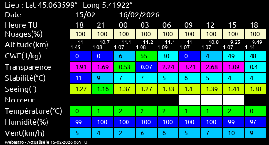 Ces paramètres sont fournis pour la nuit suivante de 12 h TU du jour en cours à 12h TU du jour suivant par pas de 3h.
