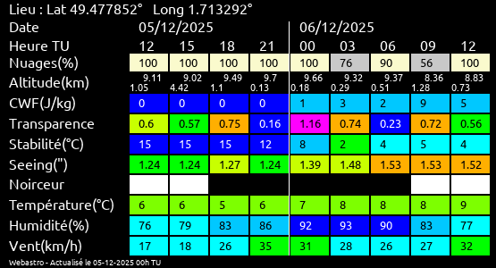 Note: Le "Met'astrogramme" est un tableau recapitulant les prévisions de différents paramètres pour estimer les conditions lors d'observation du ciel.