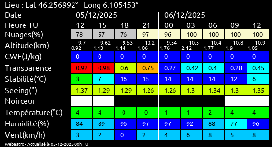 Ces paramètres sont fournis pour la nuit suivante de 12 h TU du jour en cours à 12h TU du jour suivant par pas de 3h.