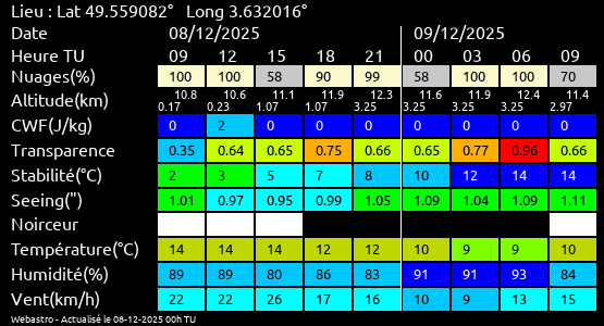 Ces paramètres sont fournis pour la nuit suivante de 12 h TU du jour en cours à 12h TU du jour suivant par pas de 3h.