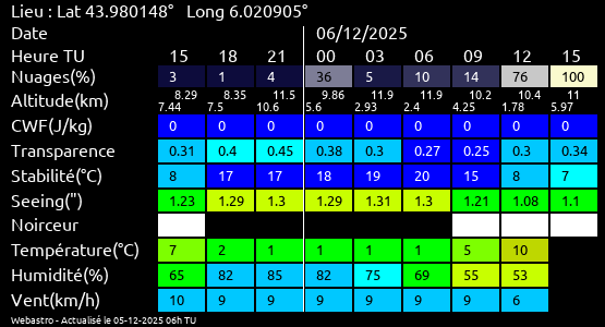 Note: Le "Met'astrogramme" est un tableau recapitulant les prévisions de différents paramètres pour estimer les conditions lors d'observation du ciel.