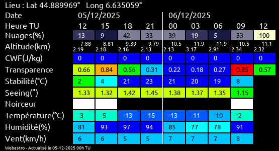 Ces paramètres sont fournis pour la nuit suivante de 12 h TU du jour en cours à 12h TU du jour suivant par pas de 3h.