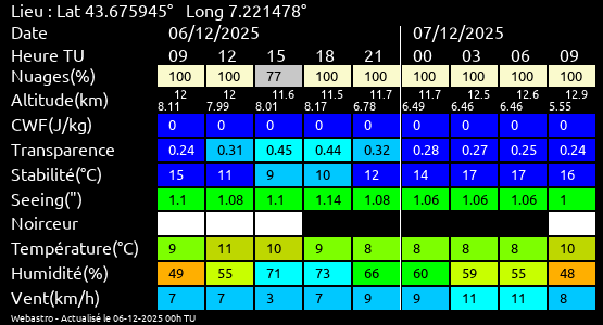 Note: Le "Met'astrogramme" est un tableau recapitulant les prévisions de différents paramètres pour estimer les conditions lors d'observation du ciel.