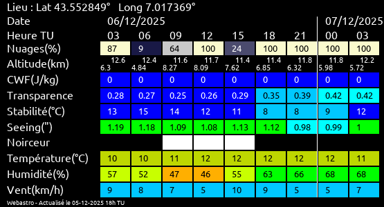 Note: Le "Met'astrogramme" est un tableau recapitulant les prévisions de différents paramètres pour estimer les conditions lors d'observation du ciel.