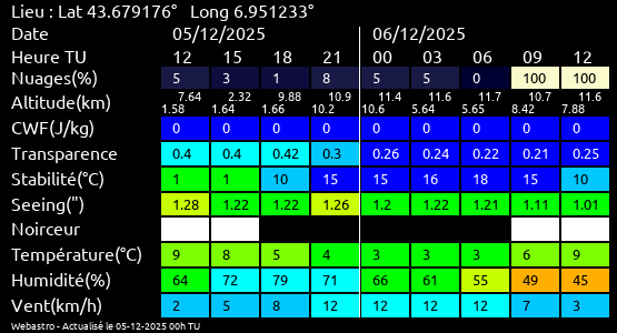 Note: Le "Met'astrogramme" est un tableau recapitulant les prévisions de différents paramètres pour estimer les conditions lors d'observation du ciel.