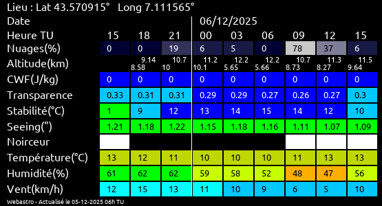Ces paramètres sont fournis pour la nuit suivante de 12 h TU du jour en cours à 12h TU du jour suivant par pas de 3h.