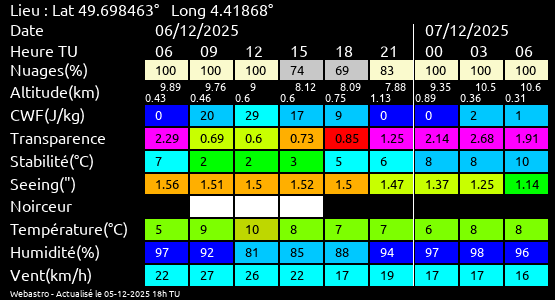 Ces paramètres sont fournis pour la nuit suivante de 12 h TU du jour en cours à 12h TU du jour suivant par pas de 3h.