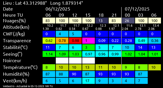 Ces paramètres sont fournis pour la nuit suivante de 12 h TU du jour en cours à 12h TU du jour suivant par pas de 3h.