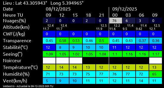 Note: Le "Met'astrogramme" est un tableau recapitulant les prévisions de différents paramètres pour estimer les conditions lors d'observation du ciel.