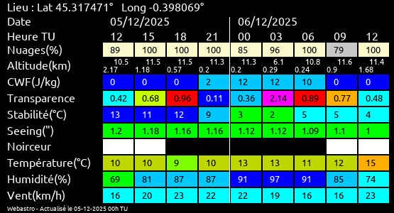 Ces paramètres sont fournis pour la nuit suivante de 12 h TU du jour en cours à 12h TU du jour suivant par pas de 3h.