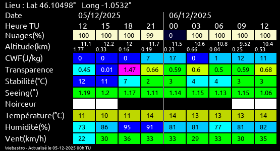 Ces paramètres sont fournis pour la nuit suivante de 12 h TU du jour en cours à 12h TU du jour suivant par pas de 3h.