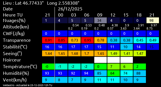 Ces paramètres sont fournis pour la nuit suivante de 12 h TU du jour en cours à 12h TU du jour suivant par pas de 3h.