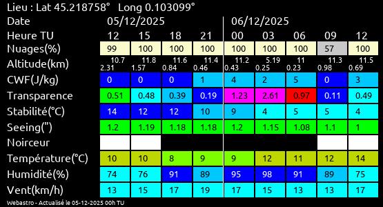Ces paramètres sont fournis pour la nuit suivante de 12 h TU du jour en cours à 12h TU du jour suivant par pas de 3h.