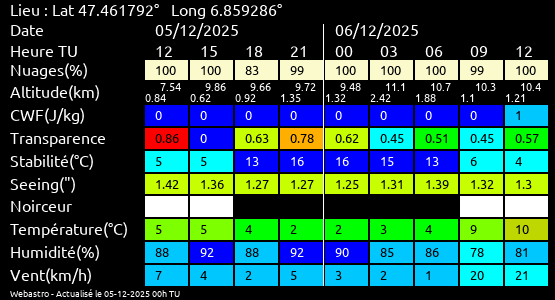 Ces paramètres sont fournis pour la nuit suivante de 12 h TU du jour en cours à 12h TU du jour suivant par pas de 3h.