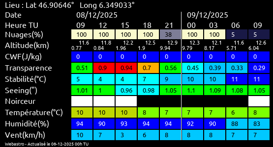 Ces paramètres sont fournis pour la nuit suivante de 12 h TU du jour en cours à 12h TU du jour suivant par pas de 3h.