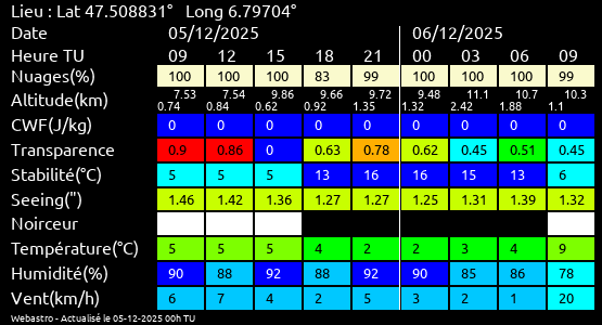 Ces paramètres sont fournis pour la nuit suivante de 12 h TU du jour en cours à 12h TU du jour suivant par pas de 3h.