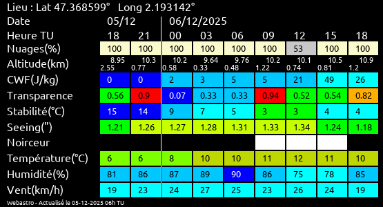 Ces paramètres sont fournis pour la nuit suivante de 12 h TU du jour en cours à 12h TU du jour suivant par pas de 3h.