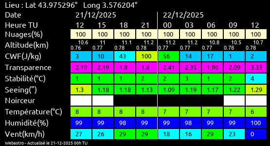 Note: Le "Met'astrogramme" est un tableau recapitulant les prévisions de différents paramètres pour estimer les conditions lors d'observation du ciel.
