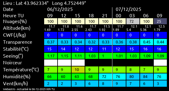 Note: Le "Met'astrogramme" est un tableau recapitulant les prévisions de différents paramètres pour estimer les conditions lors d'observation du ciel.