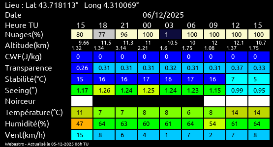 Note: Le "Met'astrogramme" est un tableau recapitulant les prévisions de différents paramètres pour estimer les conditions lors d'observation du ciel.
