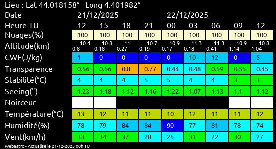 Ces paramètres sont fournis pour la nuit suivante de 12 h TU du jour en cours à 12h TU du jour suivant par pas de 3h.
