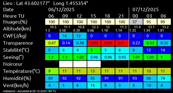 Ces paramètres sont fournis pour la nuit suivante de 12 h TU du jour en cours à 12h TU du jour suivant par pas de 3h.
