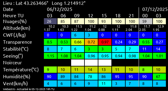 Note: Le "Met'astrogramme" est un tableau recapitulant les prévisions de différents paramètres pour estimer les conditions lors d'observation du ciel.