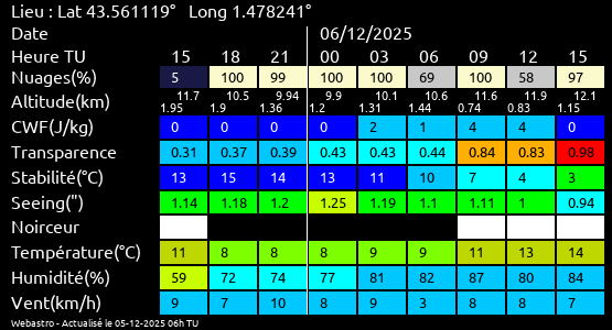 Ces paramètres sont fournis pour la nuit suivante de 12 h TU du jour en cours à 12h TU du jour suivant par pas de 3h.