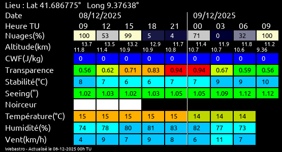 Ces paramètres sont fournis pour la nuit suivante de 12 h TU du jour en cours à 12h TU du jour suivant par pas de 3h.