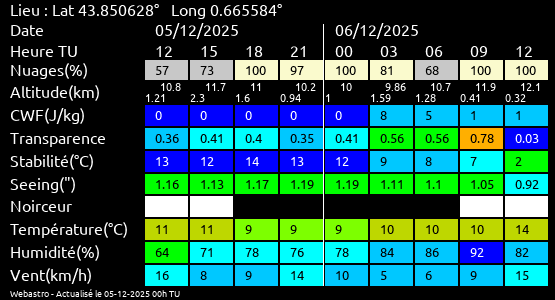 Ces paramètres sont fournis pour la nuit suivante de 12 h TU du jour en cours à 12h TU du jour suivant par pas de 3h.