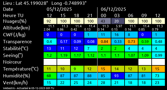 Ces paramètres sont fournis pour la nuit suivante de 12 h TU du jour en cours à 12h TU du jour suivant par pas de 3h.