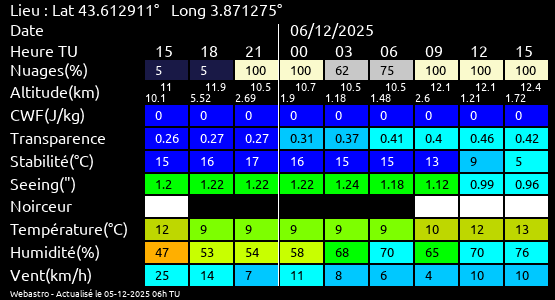 Note: Le "Met'astrogramme" est un tableau recapitulant les prévisions de différents paramètres pour estimer les conditions lors d'observation du ciel.