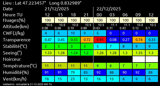 Ces paramètres sont fournis pour la nuit suivante de 12 h TU du jour en cours à 12h TU du jour suivant par pas de 3h.