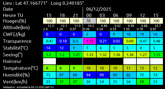 Ces paramètres sont fournis pour la nuit suivante de 12 h TU du jour en cours à 12h TU du jour suivant par pas de 3h.
