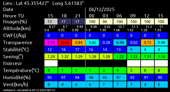 Ces paramètres sont fournis pour la nuit suivante de 12 h TU du jour en cours à 12h TU du jour suivant par pas de 3h.
