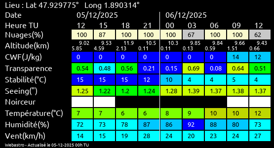 Ces paramètres sont fournis pour la nuit suivante de 12 h TU du jour en cours à 12h TU du jour suivant par pas de 3h.