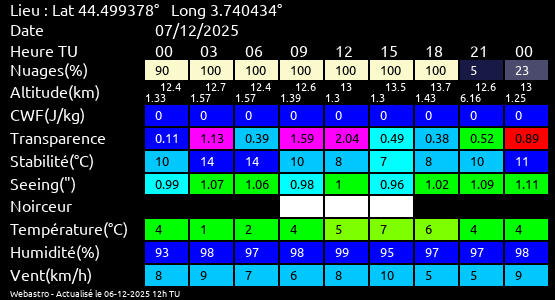 Ces paramètres sont fournis pour la nuit suivante de 12 h TU du jour en cours à 12h TU du jour suivant par pas de 3h.