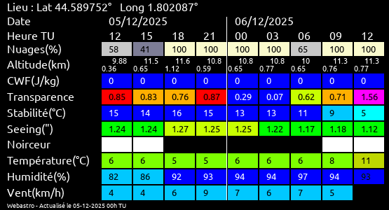 Note: Le "Met'astrogramme" est un tableau recapitulant les prévisions de différents paramètres pour estimer les conditions lors d'observation du ciel.