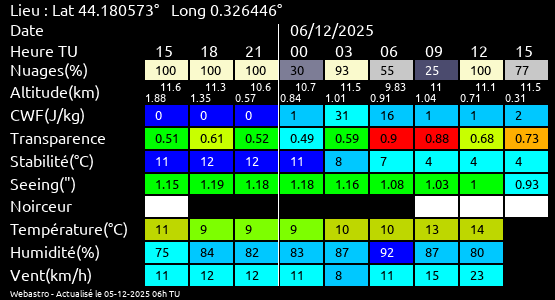 Note: Le "Met'astrogramme" est un tableau recapitulant les prévisions de différents paramètres pour estimer les conditions lors d'observation du ciel.