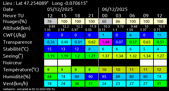 Ces paramètres sont fournis pour la nuit suivante de 12 h TU du jour en cours à 12h TU du jour suivant par pas de 3h.