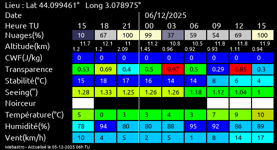 Ces paramètres sont fournis pour la nuit suivante de 12 h TU du jour en cours à 12h TU du jour suivant par pas de 3h.