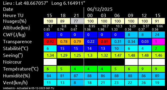 Note: Le "Met'astrogramme" est un tableau recapitulant les prévisions de différents paramètres pour estimer les conditions lors d'observation du ciel.